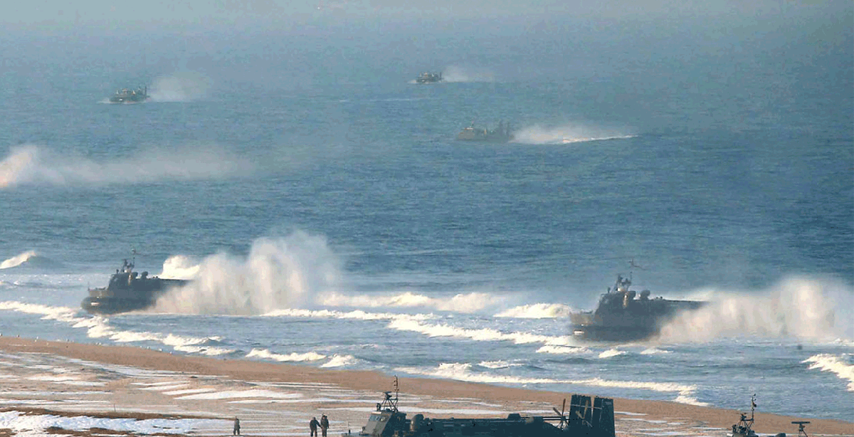 A three-step animation sequence, showing how the image of the hovercraft at left appeared to be manipulated digitally. 1) The section is selected, and copied. 2) The selection is moved toward the new placement. 3) Once placed, the image is sized up to simulate perspective shift, then the hard edges are softly erased, so it will blend in. (KCNA Via KNS/AFP/Getty Images) #