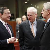 Draghi, Maystadt e Monti all’Ecofin di Bruxelles (EPA)